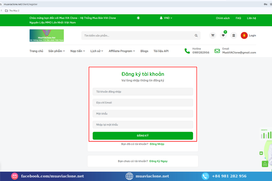 - Đầu tiền bạn truy cập vào link đăng ký sau: https://muaviaclone.net/client/register