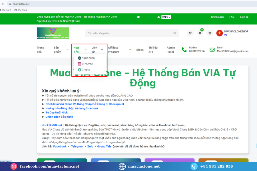 Hiện nay, có rất nhiều anh em cần mua via để chạy quảng cáo, seeding, hay nhu cầu khác. Tuy nhiên lại không biết cách để mua sao cho nhanh và tiện lợi nhất. Hôm nay MUAVIA.COM.VN xin phép được chia sẻ cách để có thể giao dịch hoàn toàn tự động trong 1 phút vô cùng tiện lợi và an toàn tại website mua bán tài nguyên: muaviaclone.net